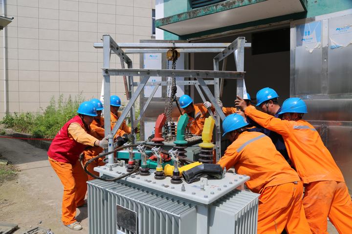 現(xiàn)場,施工人員8個人一組,把老舊的電纜拆除,將新的線徑更粗的電纜穿過地下孔洞,繞到配電室一側(cè),再重新搭接線路。停電、驗電、吊離變壓器,安裝新變壓器……供電員工沒有片刻停頓,每個步驟有條不紊,迅速完成增容任務(wù)。