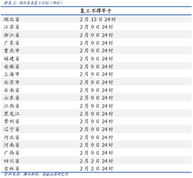 受新型冠狀病毒影響,各省復(fù)工時間延后。2020年春節(jié)前夕,國內(nèi)爆發(fā)新型冠狀病毒肺炎疫情,由于本次疫情傳染性較強(qiáng),各省市落實(shí)突發(fā)公共衛(wèi)生事件響應(yīng),延后城市復(fù)工時間,以防止新型冠狀病毒傳染的疫情擴(kuò)散和蔓延。部分省市將復(fù)工時間延遲到2020年2月9日24時之后復(fù)工,較原定計(jì)劃復(fù)工時間延后一周左右。